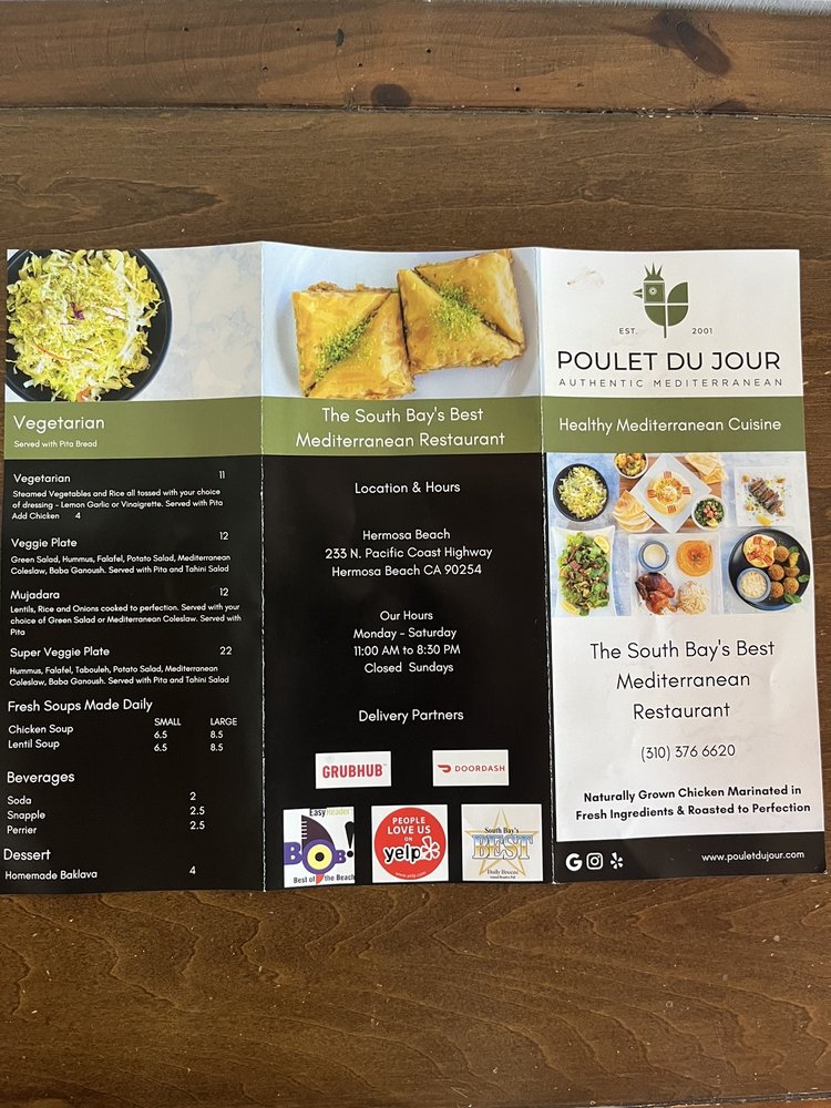 Welcome to Poulet Du Jour, a delightful haven for lovers of Middle Eastern and Greek cuisine nestled in the heart of Hermosa Beach. Located at 233 Pacific Coast Hwy, this eatery has been a staple in the community for over 20 years, gaining a loyal following and rave reviews that speak volumes about its quality and authenticity.